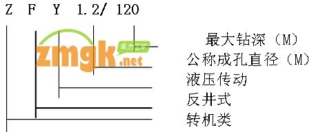 標注示例: ZFY1.2/120(A)型反井鉆機,表示公稱成孔直徑為1.2m,最大鉆深為120m,第一次改進設計的反井式液壓傳動的鉆機。