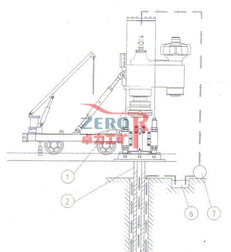 5- 從環(huán)形空間返回的攜帶巖渣泥漿;6- 泥漿循環(huán)池;7- 泥漿泵